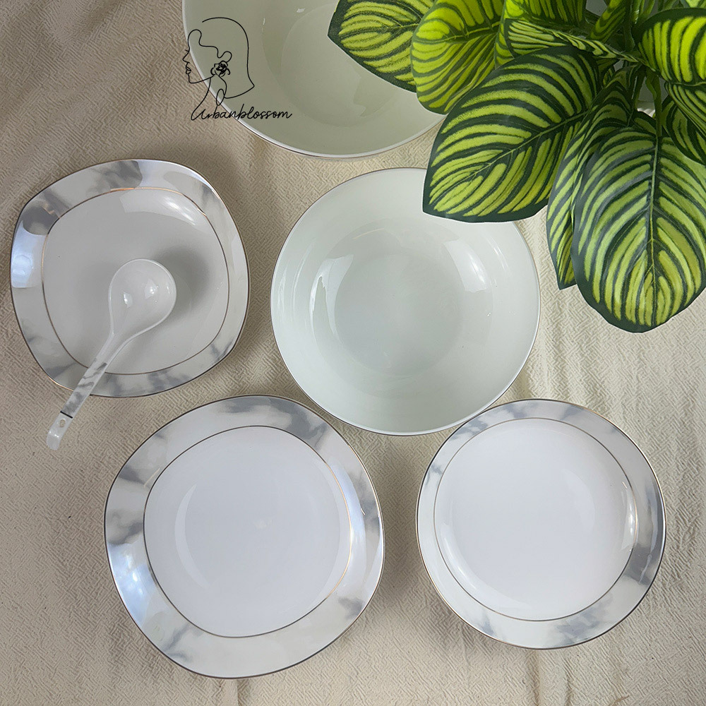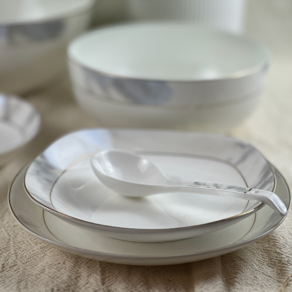 這套骨瓷餐具以大理石紋理結合優雅金邊,展現低調奢華的質感。整體以白色為基底,紋理自然流暢,搭配高透光骨瓷材質,不僅輕巧堅韌,更能提升餐桌氛圍。無論日常用餐或宴客,都能呈現高雅不凡的格調。