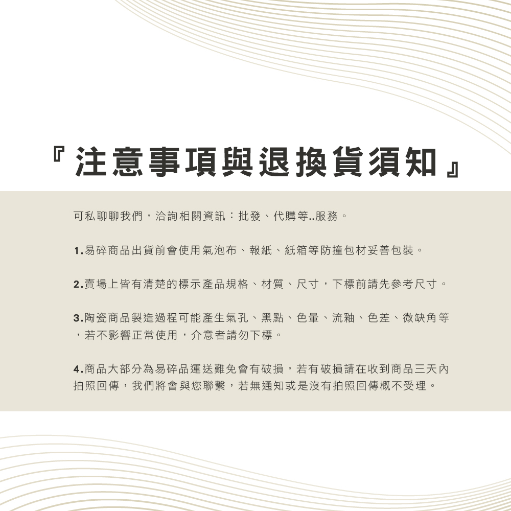 ③ 陶瓷商品製造過程可能產生氣孔、黑點、色暈、流釉、色差、微缺角等,若不影響正常使用,介意者請勿下標。